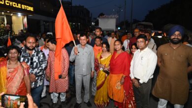 भगवा ध्वज लेकर रामनवमी के शोभायात्रा में शामिल हुए मंत्री लखन लाल देवांगन।