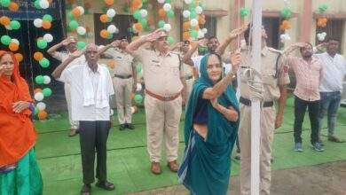 पुलिस चौकी में बुजुर्ग महिला ने किया ध्वजारोहण