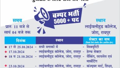 15 अक्टूबर को छत्तीसगढ़ काॅलेज में होगा ऑफलाइन पंजीयन 17 अक्टूबर से विभिन्न स्थानों पर होगा साक्षात्कार 7 हजार…