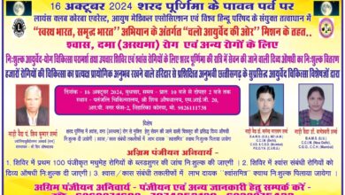 श्वास दमा रोगियों हेतु 16 अक्टूबर को निशुल्क आयुर्वेद-योग चिकित्सा परामर्श एवं उपचार शिविर का आयोजन