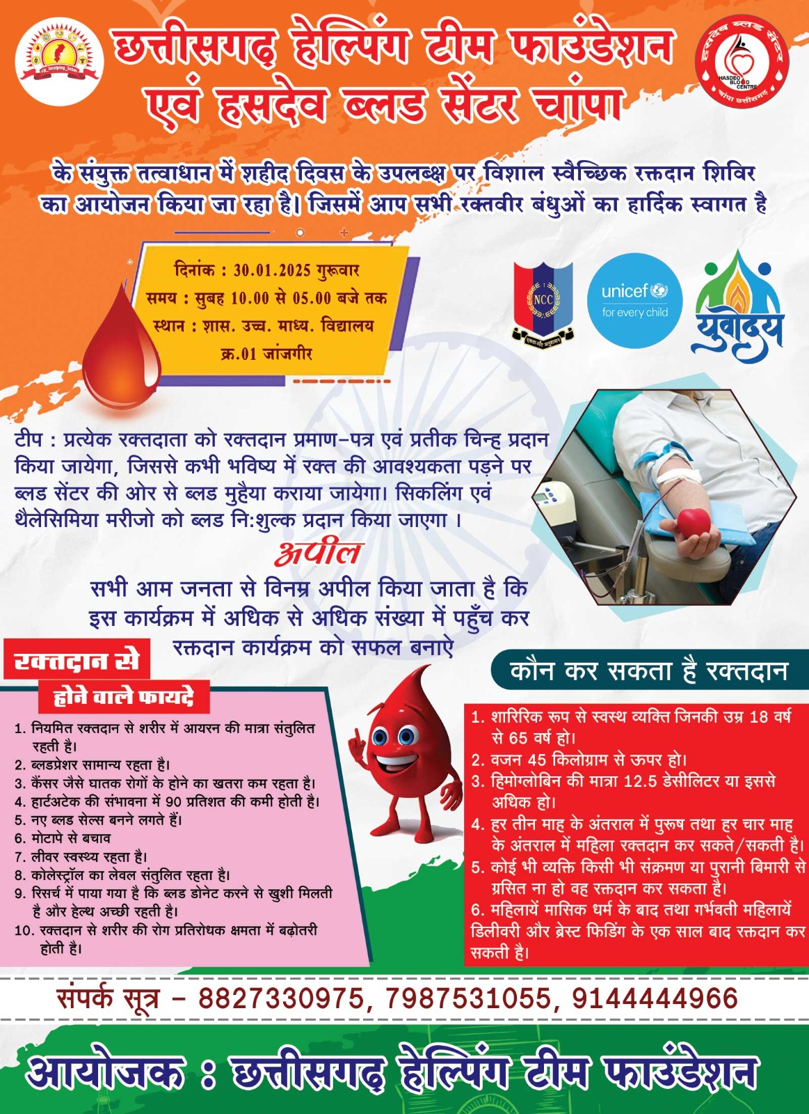 (ट्रैक सिटी)/ C.g_helping_team एवं Hasdev blood bank जांजगीर चांपा के संयुक्त तत्वाधान में विशाल रक्तदान शिविर का आयोजन 30/01/2025 को शासकीय उच्च माध्यमिक विद्यालय जांजगीर में किया जा रहा है।