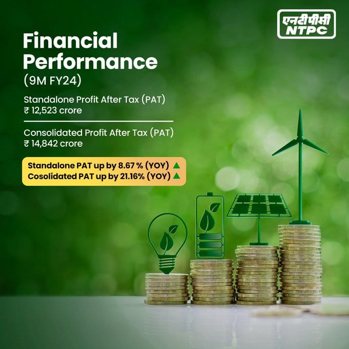 On standalone basis, the Total Income of NTPC for 9M FY24 is ₹ 1,21,486 crore as against the corresponding previous period total income of ₹ 1,24,685 crore. Profit After Tax (PAT) for 9MFY24 is ₹ 12,523 crore as against ₹ 11,524 crore in the corresponding previous period, registering an increase of 8.67%.